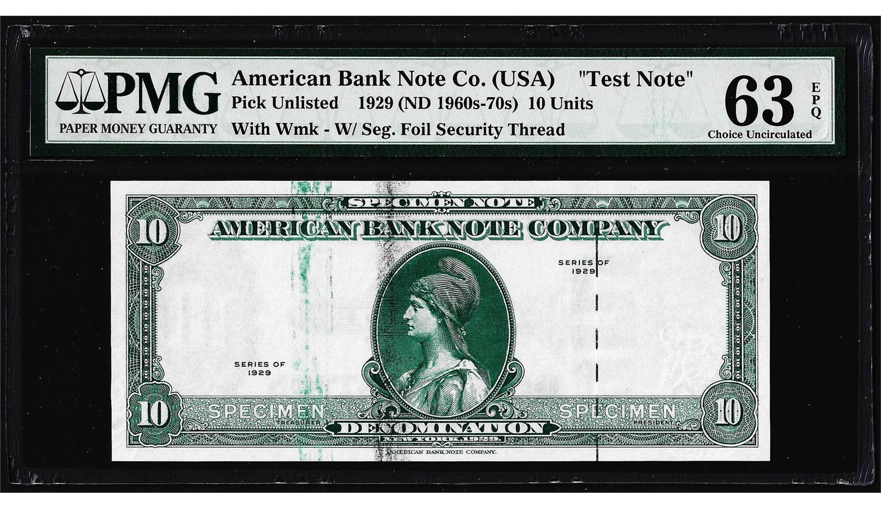 One 1929 10 Unit American Bank Note Co. "Test Note" PMG Choice Uncirculated 63EPQ. PMG Certified.