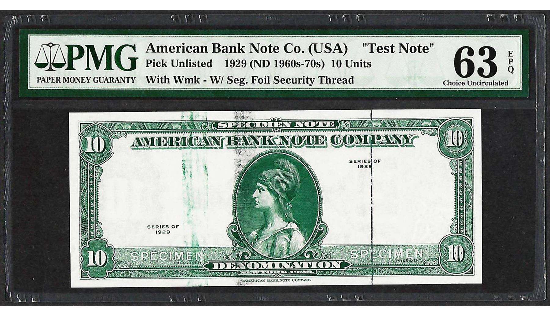 One 1929 10 Unit American Bank Note Co. "Test Note" PMG Choice Uncirculated 63EPQ. PMG Certified.
