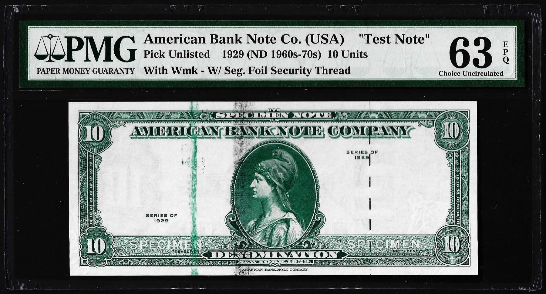1929 10 Unit American Bank Note Co. "Test Note" PMG Choice Uncirculated 63EPQ