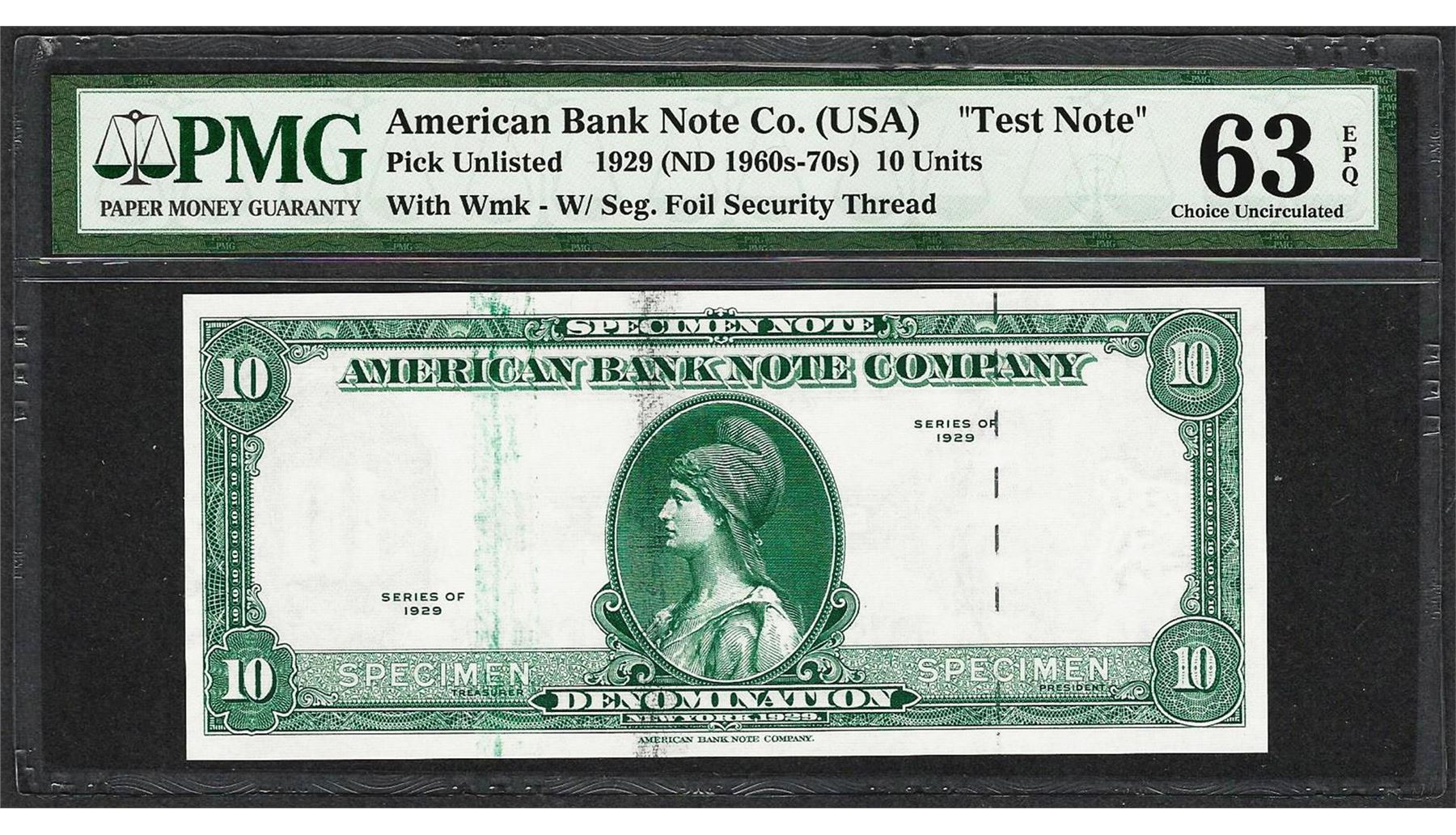 One 1929 10 Unit American Bank Note Co. "Test Note" PMG Choice Uncirculated 63EPQ. PMG Certified.