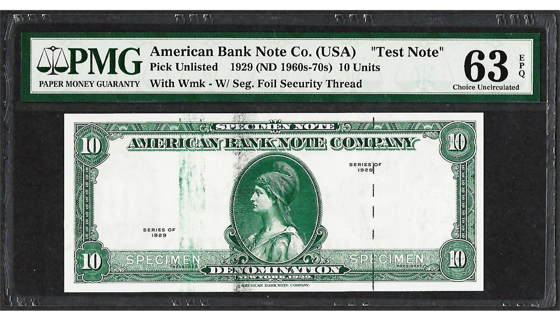 One 1929 10 Unit American Bank Note Co. "Test Note" PMG Choice Uncirculated 63EPQ. PMG Certified.