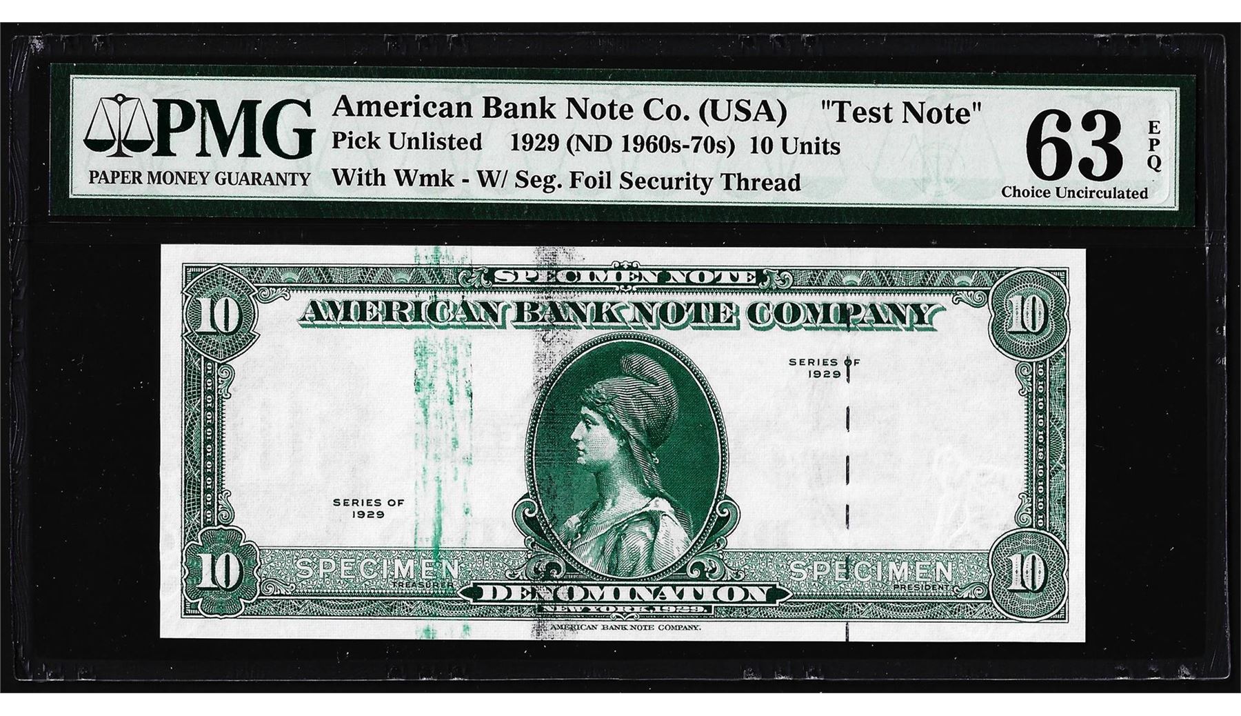 One 1929 10 Unit American Bank Note Co. "Test Note" PMG Choice Uncirculated 63EPQ. PMG Certified.