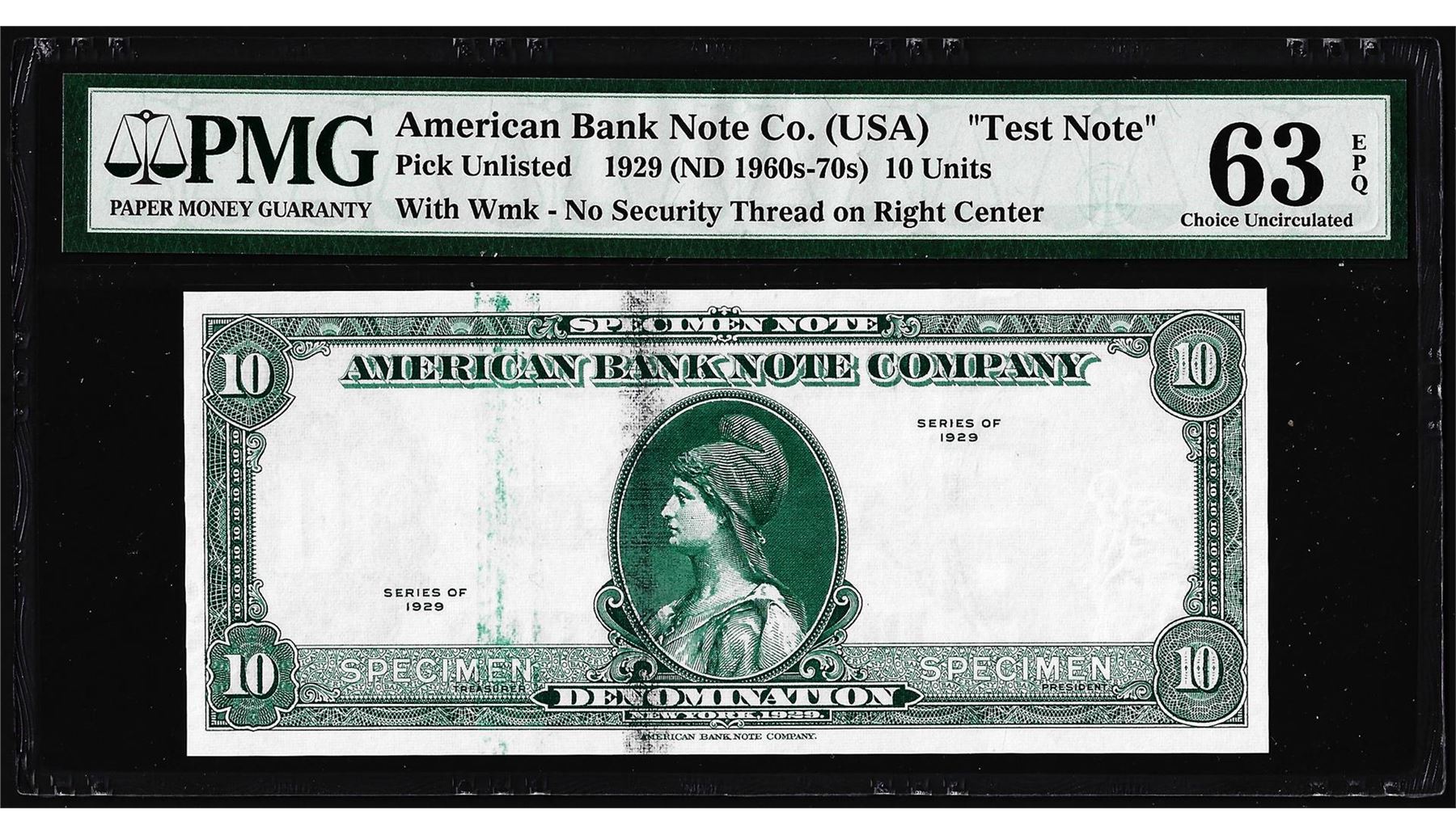 One 1929 10 Unit American Bank Note Co. "Test Note" PMG Choice Uncirculated 63EPQ. PMG Certified.