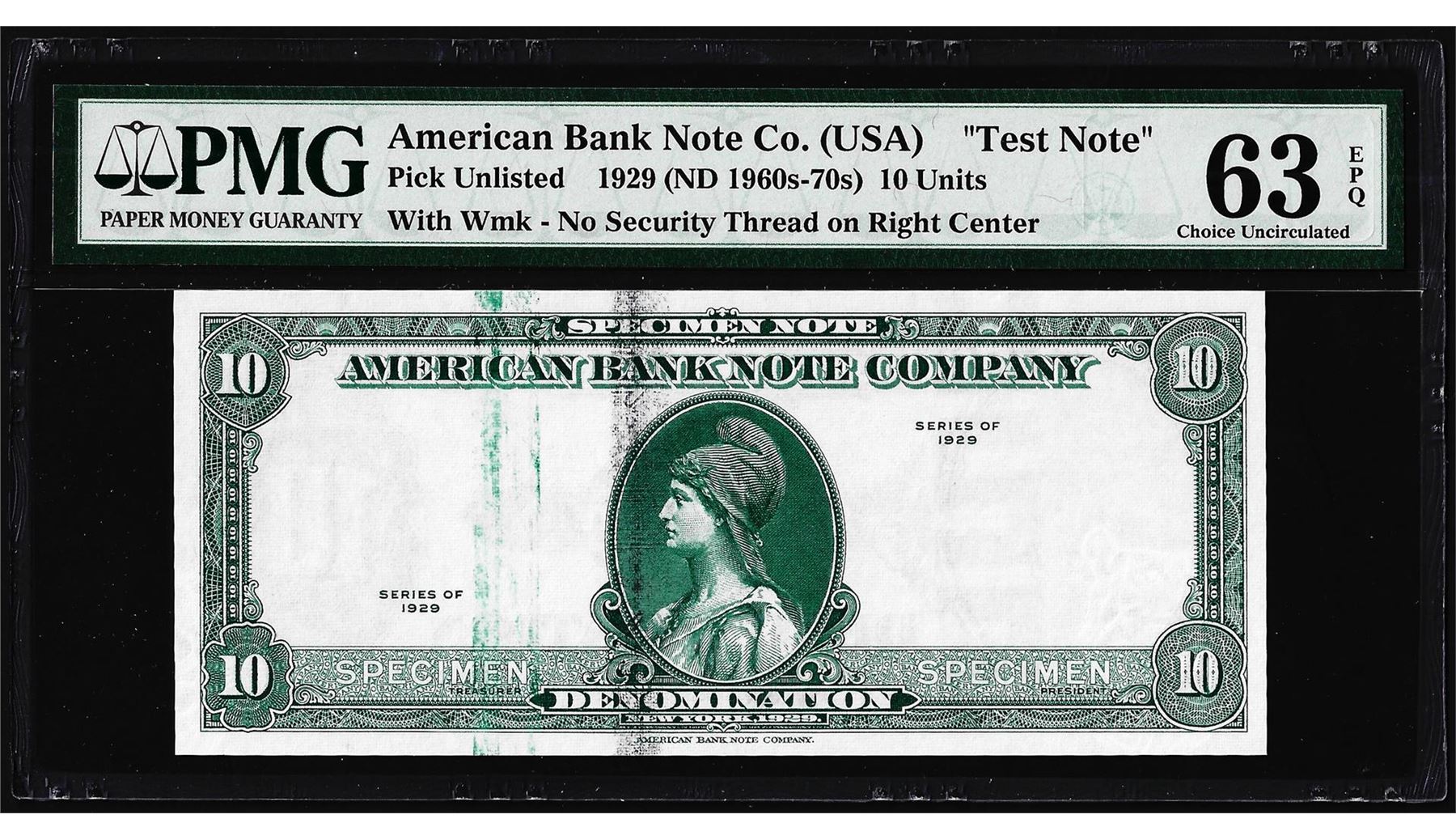 One 1929 10 Unit American Bank Note Co. "Test Note" PMG Choice Uncirculated 63EPQ. PMG Certified.