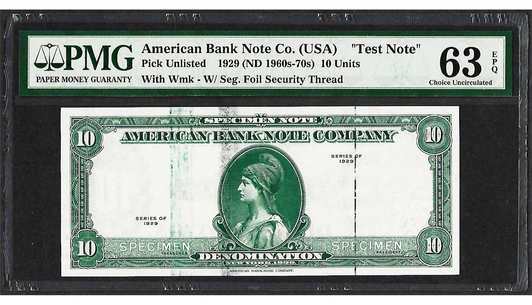 One 1929 10 Unit American Bank Note Co. "Test Note" PMG Choice Uncirculated 63EPQ. PMG Certified.