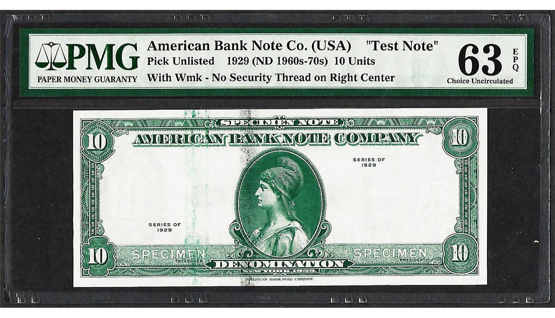 One 1929 10 Unit American Bank Note Co. "Test Note" PMG Choice Uncirculated 63EPQ. PMG Certified.