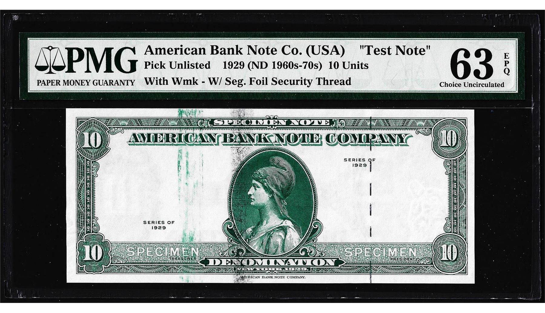 One 1929 10 Unit American Bank Note Co. "Test Note" PMG Choice Uncirculated 63EPQ. PMG Certified.