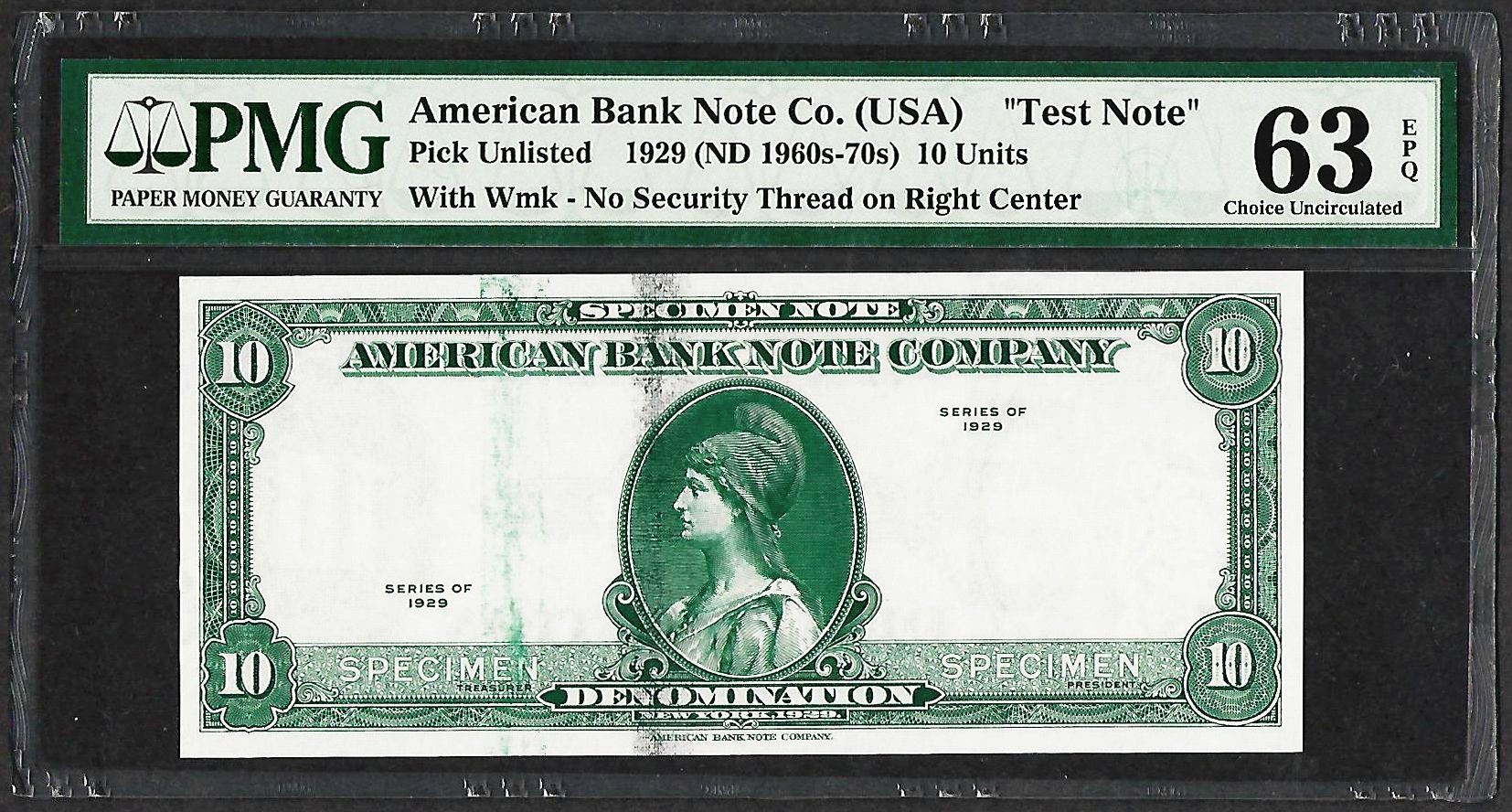 1929 10 Unit American Bank Note Co. "Test Note" PMG Choice Uncirculated 63EPQ
