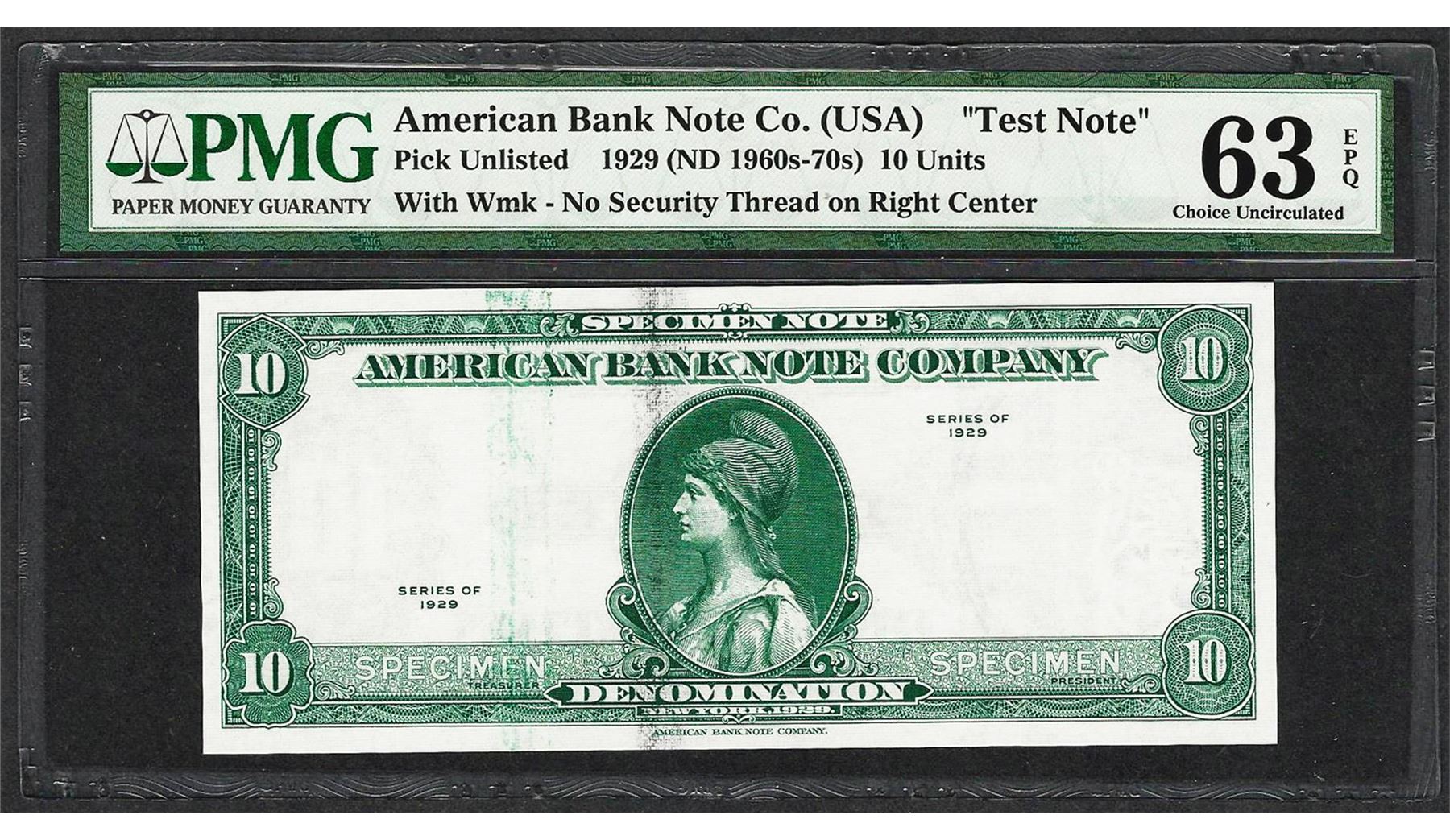 One 1929 10 Unit American Bank Note Co. "Test Note" PMG Choice Uncirculated 63EPQ. PMG Certified.