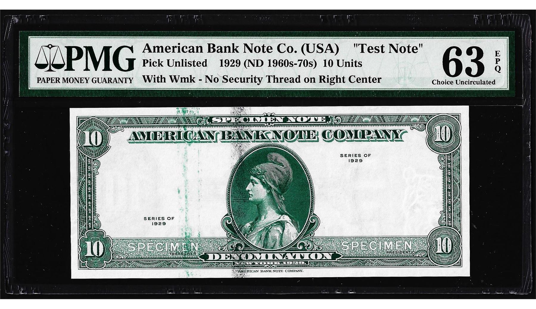 One 1929 10 Unit American Bank Note Co. "Test Note" PMG Choice Uncirculated 63EPQ. PMG Certified.