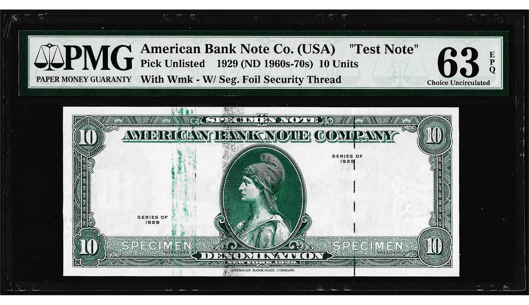 One 1929 10 Unit American Bank Note Co. "Test Note" PMG Choice Uncirculated 63EPQ. PMG Certified.