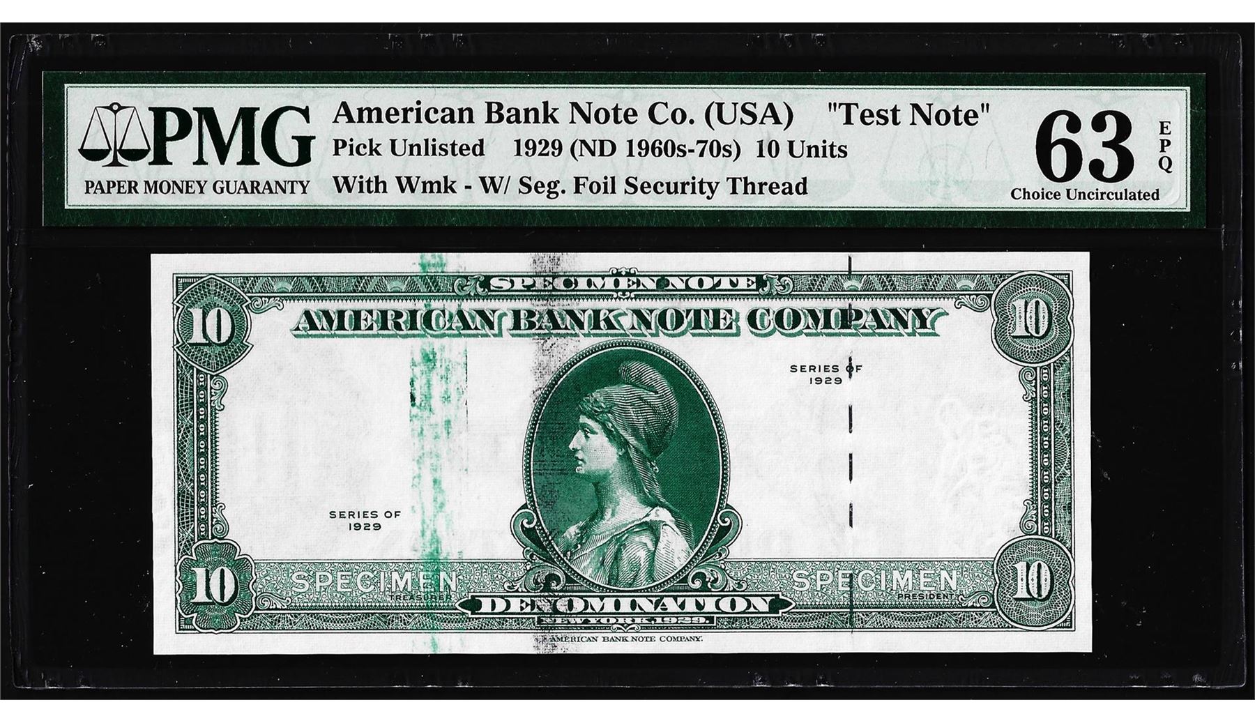 One 1929 10 Unit American Bank Note Co. "Test Note" PMG Choice Uncirculated 63EPQ. PMG Certified.