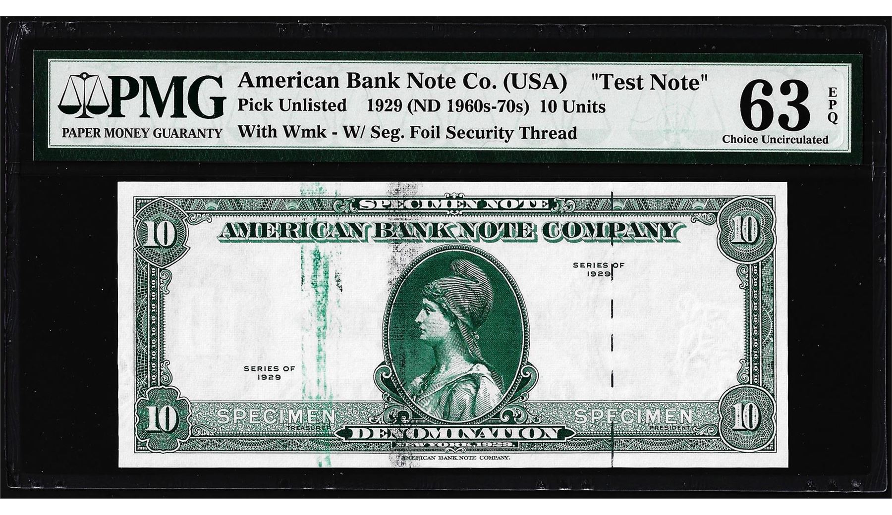 One 1929 10 Unit American Bank Note Co. "Test Note" PMG Choice Uncirculated 63EPQ. PMG Certified.