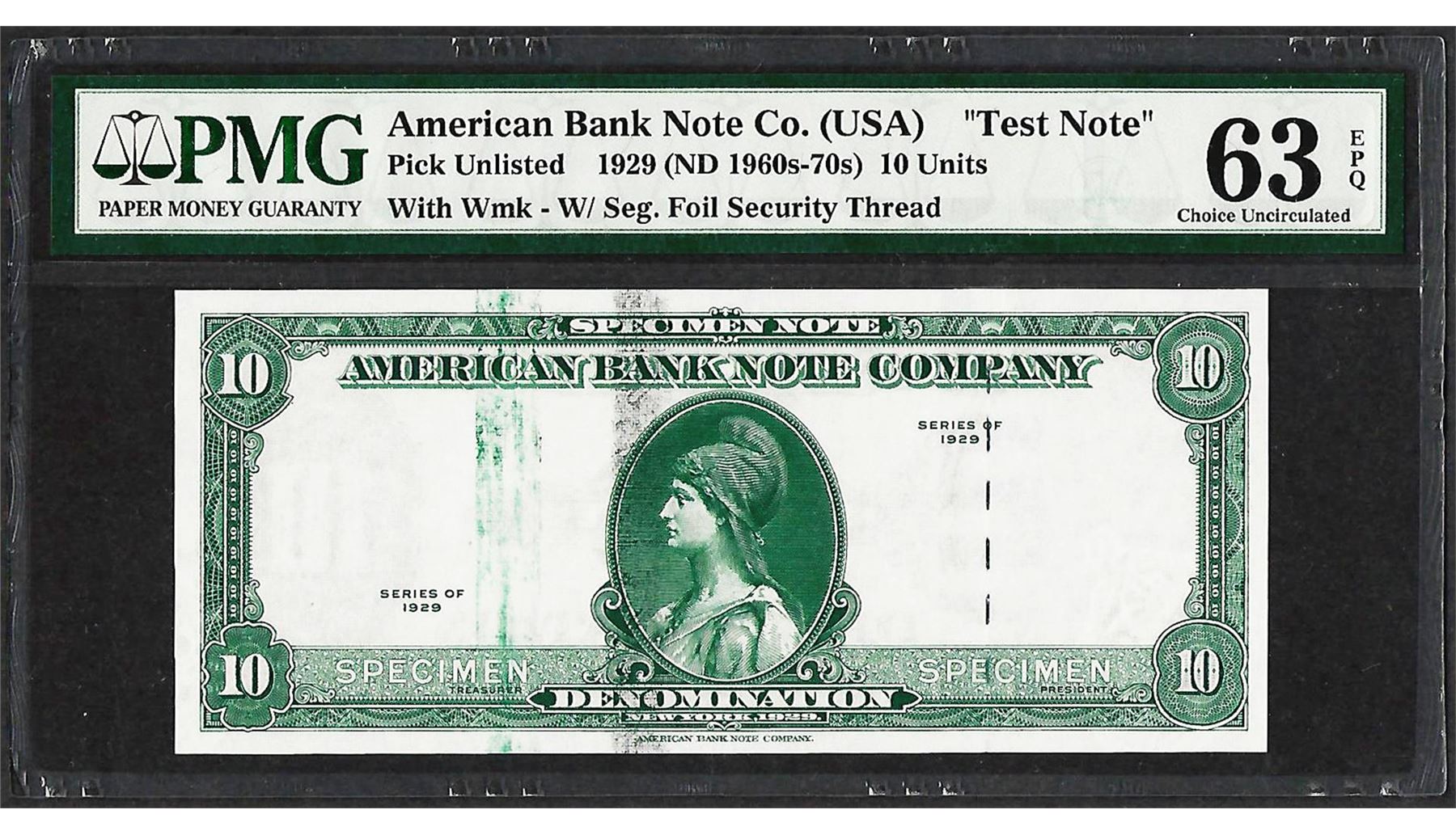 One 1929 10 Unit American Bank Note Co. "Test Note" PMG Choice Uncirculated 63EPQ. PMG Certified.