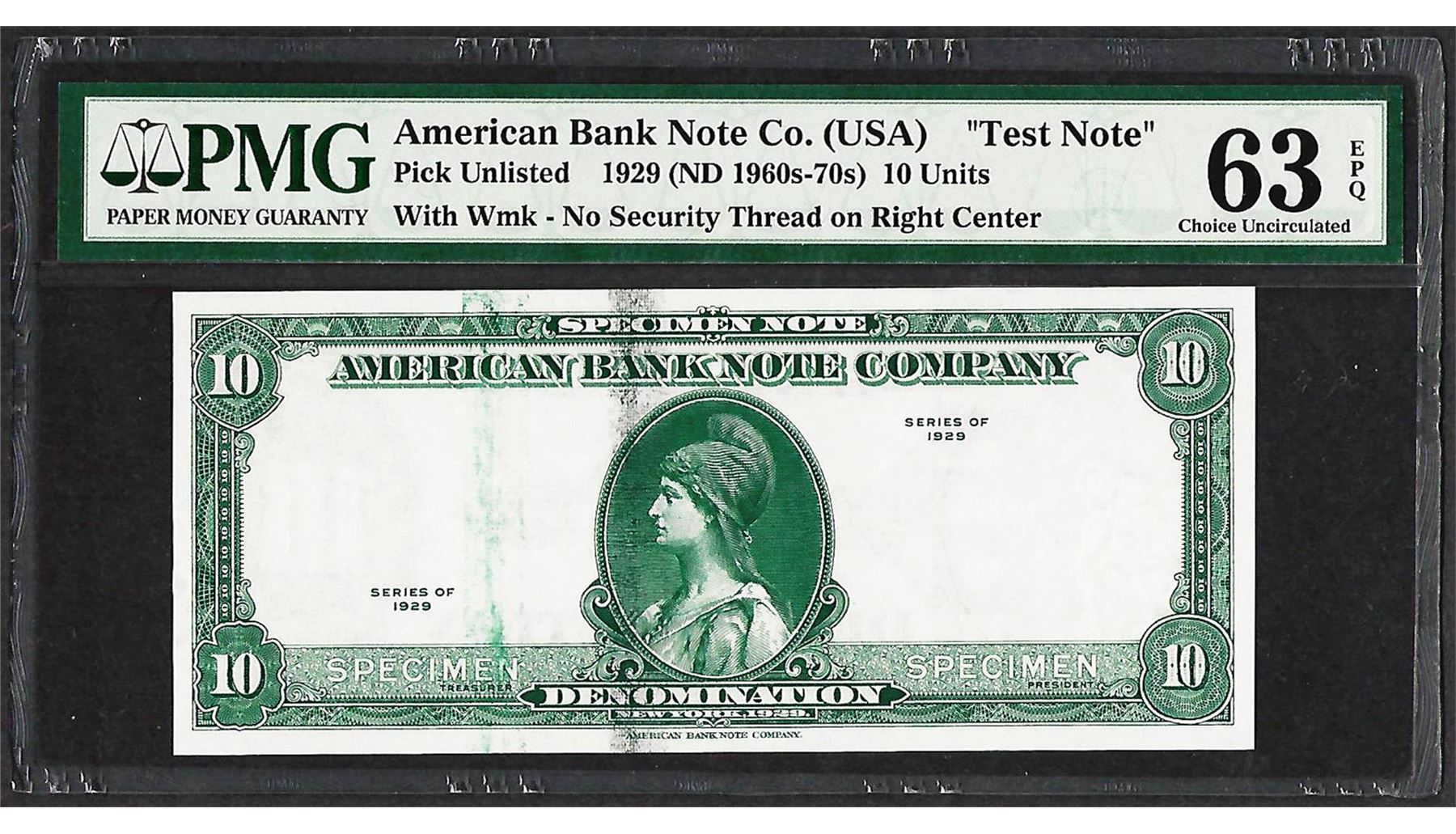 One 1929 10 Unit American Bank Note Co. "Test Note" PMG Choice Uncirculated 63EPQ. PMG Certified.