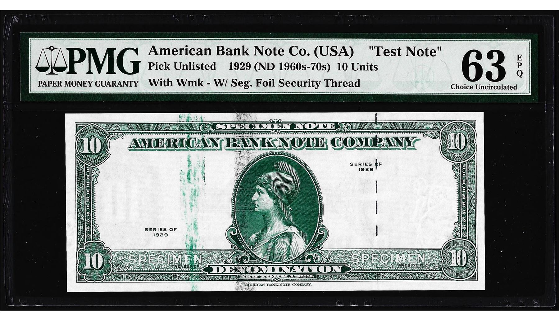 One 1929 10 Unit American Bank Note Co. "Test Note" PMG Choice Uncirculated 63EPQ. PMG Certified.