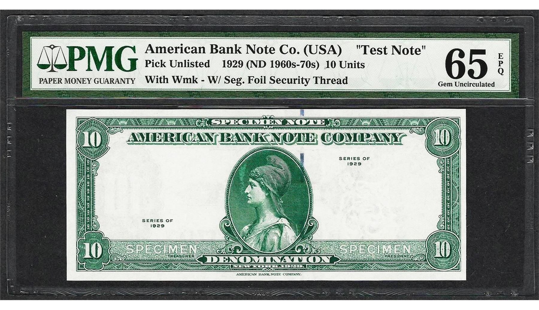 One 1929 10 Unit American Bank Note Co. "Test Note" PMG Gem Uncirculated 65EPQ. PMG Certified.