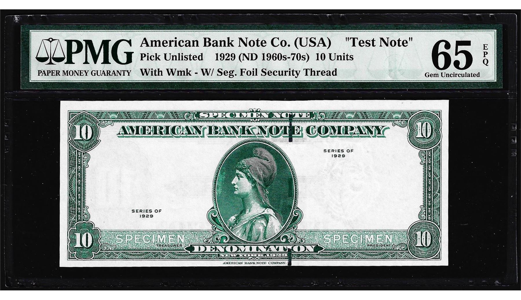 One 1929 10 Unit American Bank Note Co. "Test Note" PMG Gem Uncirculated 65EPQ. PMG Certified.
