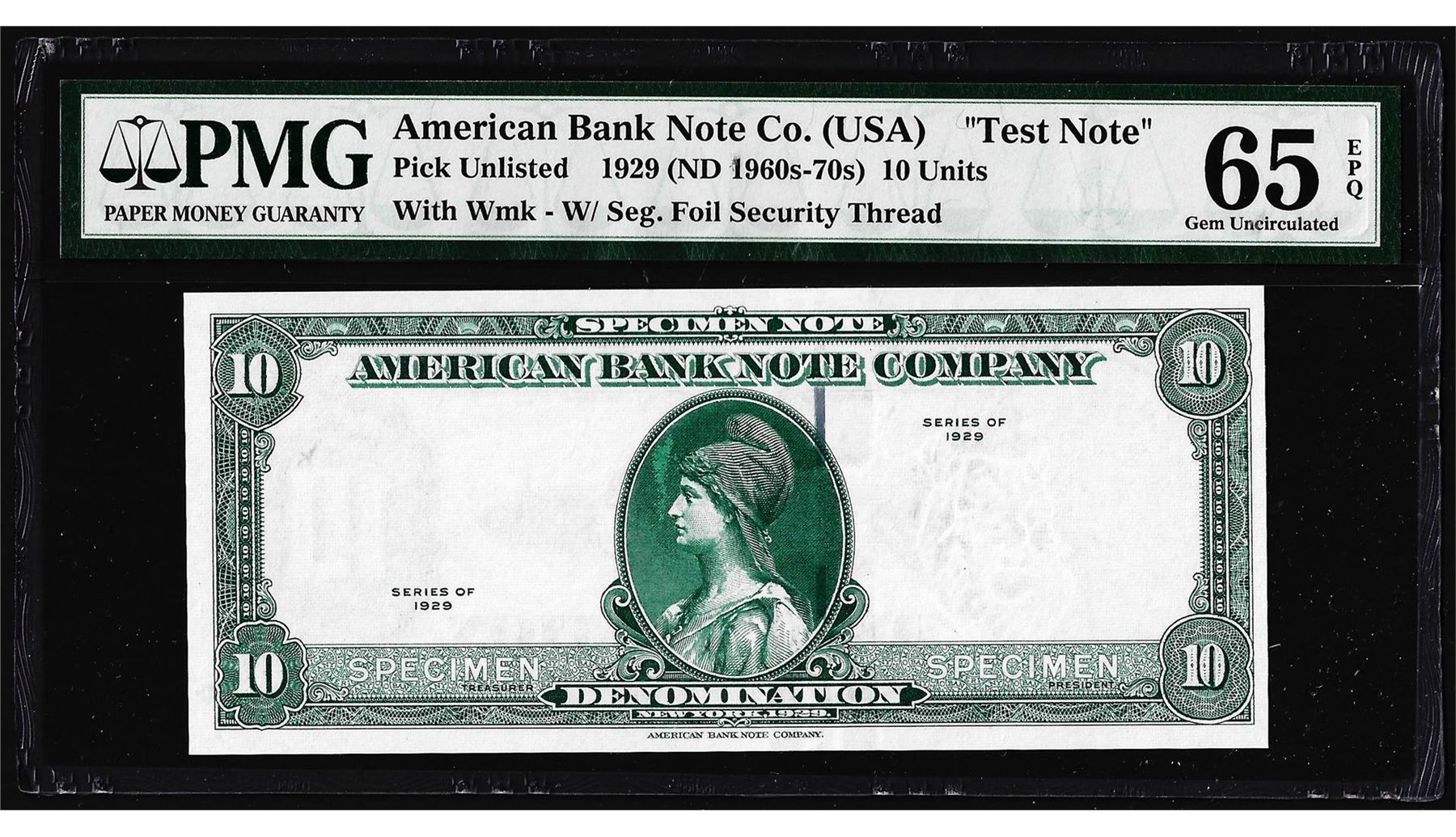 One 1929 10 Unit American Bank Note Co. "Test Note" PMG Gem Uncirculated 65EPQ. PMG Certified.