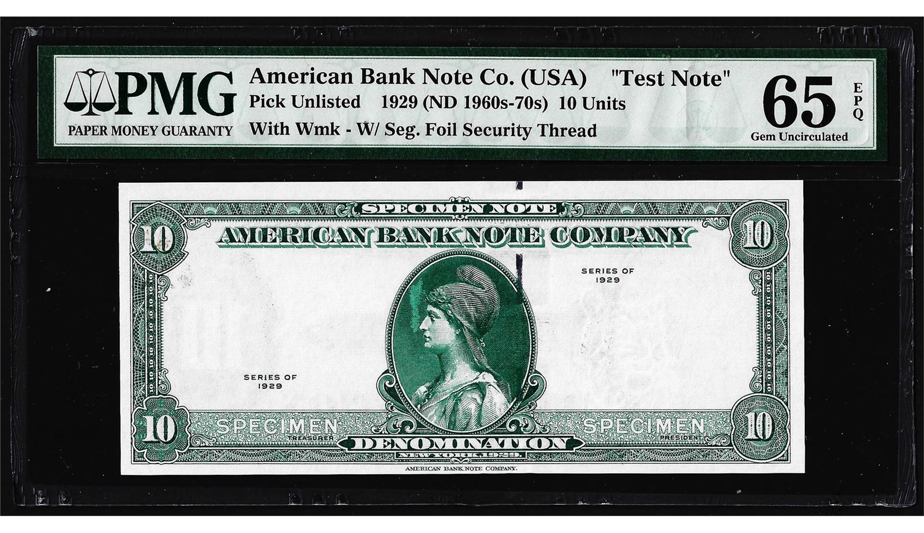 One 1929 10 Unit American Bank Note Co. "Test Note" PMG Gem Uncirculated 65EPQ. PMG Certified.
