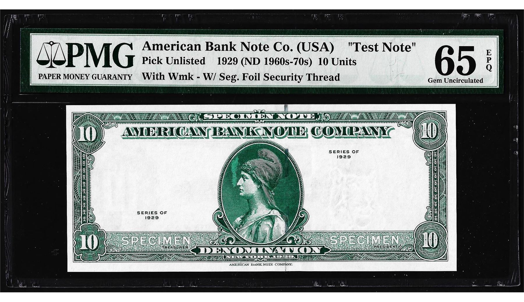 One 1929 10 Unit American Bank Note Co. "Test Note" PMG Gem Uncirculated 65EPQ. PMG Certified.