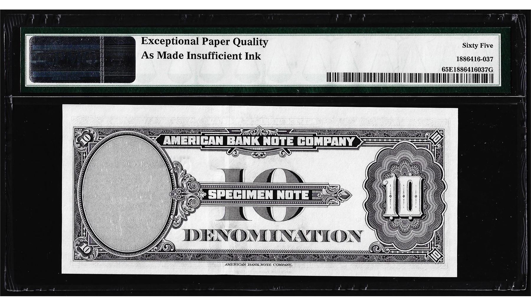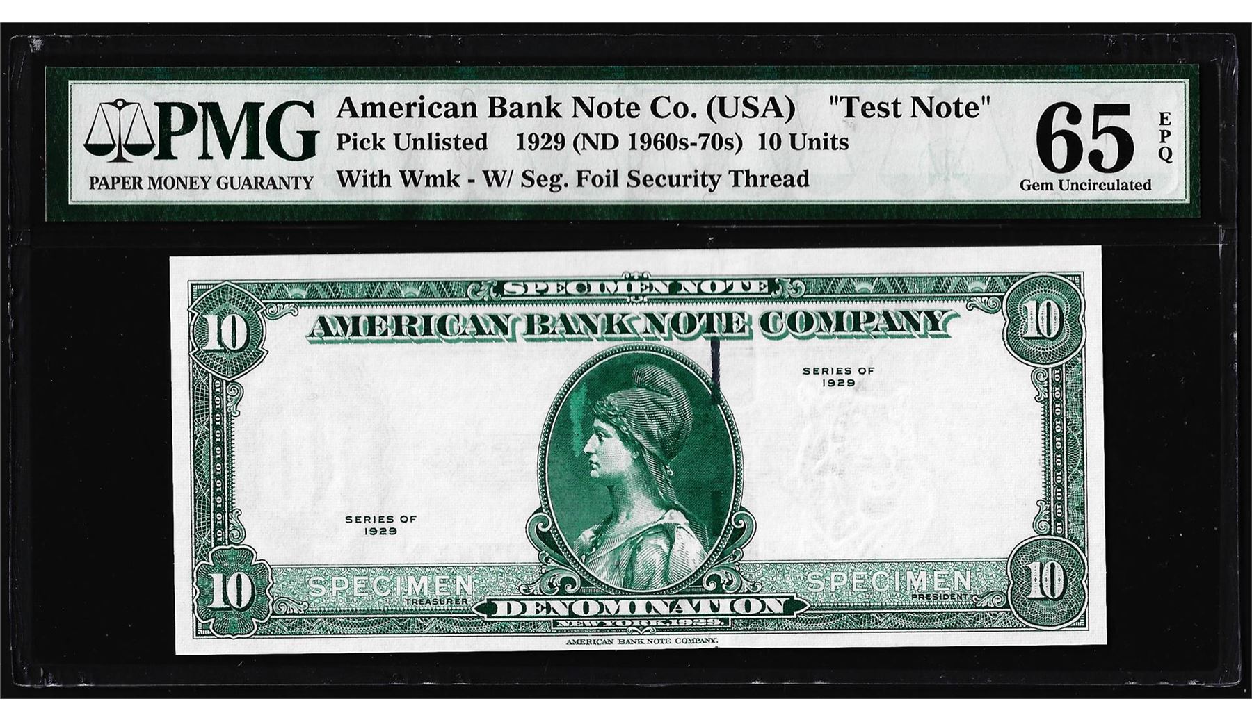 One 1929 10 Unit American Bank Note Co. "Test Note" PMG Gem Uncirculated 65EPQ. PMG Certified.
