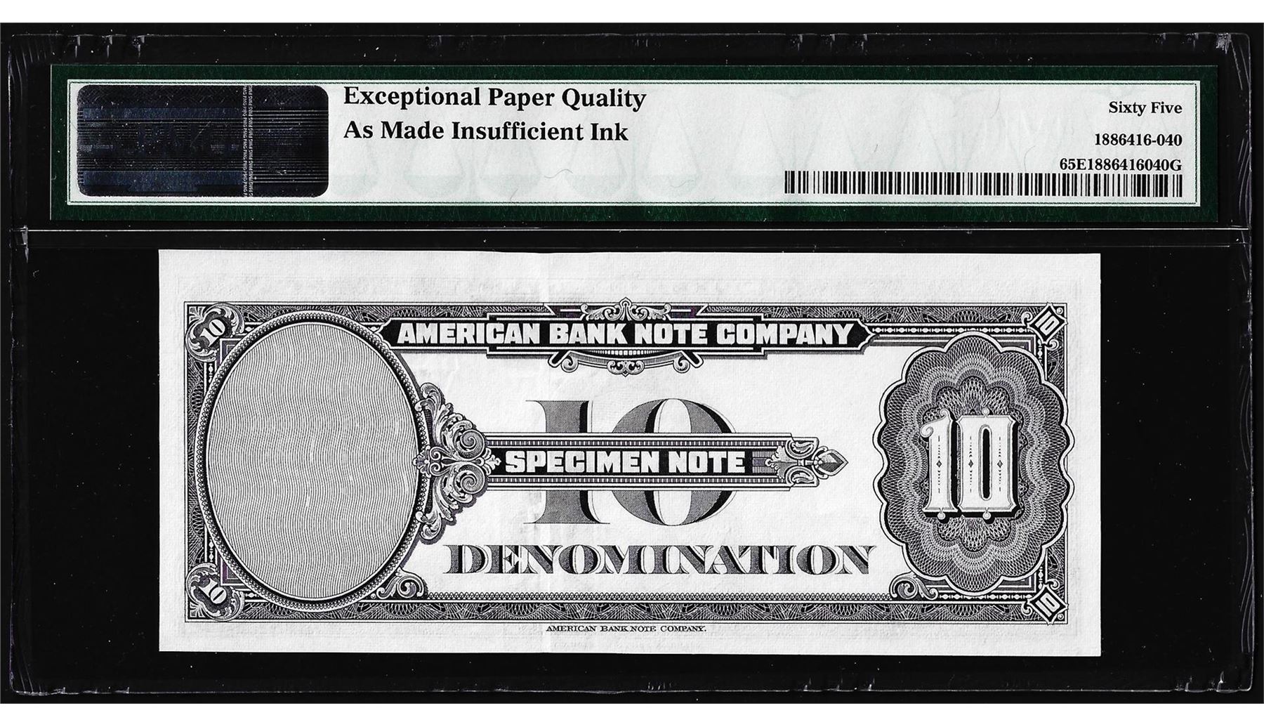 One 1929 10 Unit American Bank Note Co. "Test Note" PMG Gem Uncirculated 65EPQ. PMG Certified.
