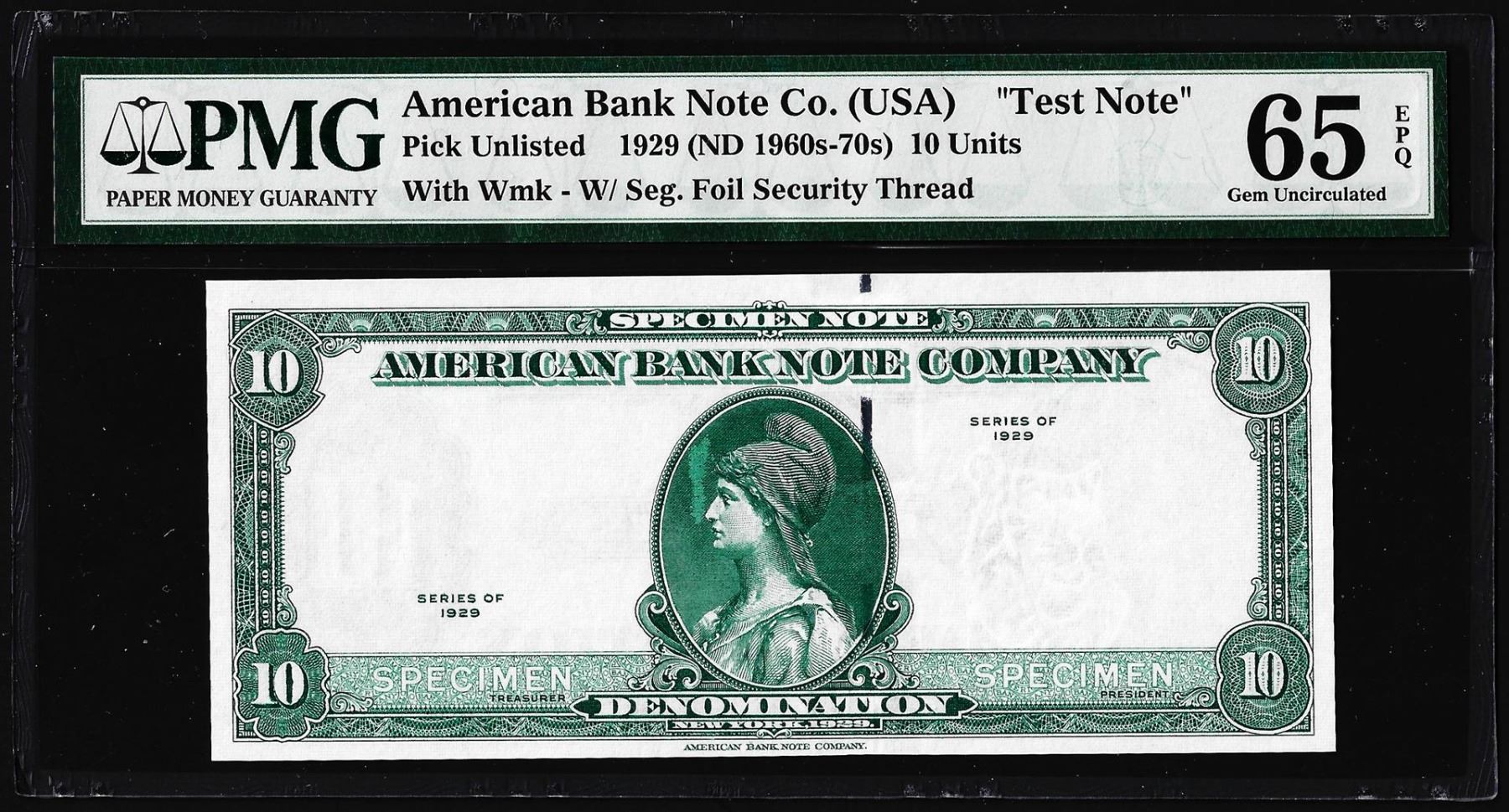 One 1929 10 Unit American Bank Note Co. "Test Note" PMG Gem Uncirculated 65EPQ. PMG Certified.