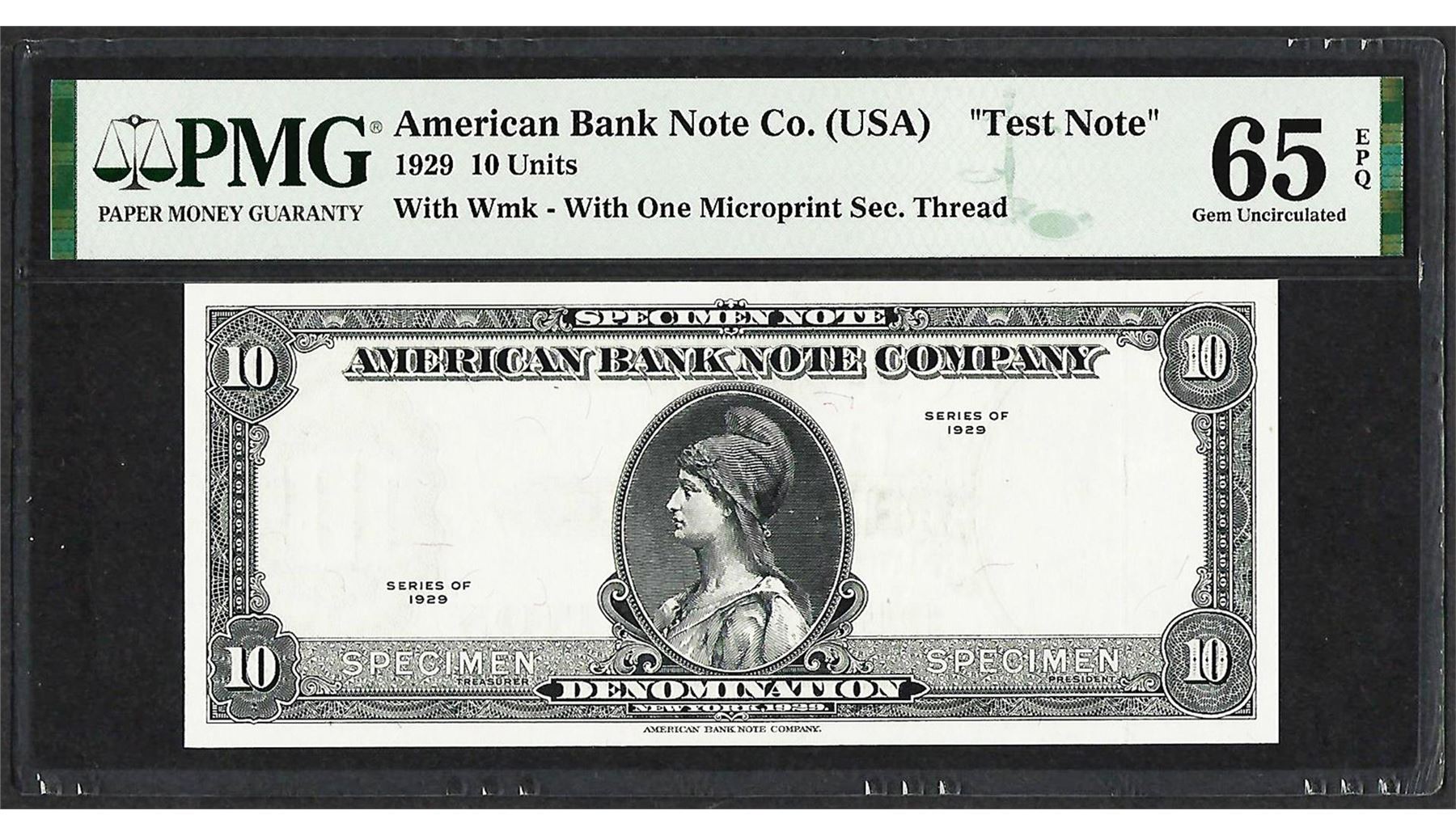 One 1929 10 Unit American Bank Note Co. "Test Note" PMG Gem Uncirculated 65EPQ. PMG Certified.