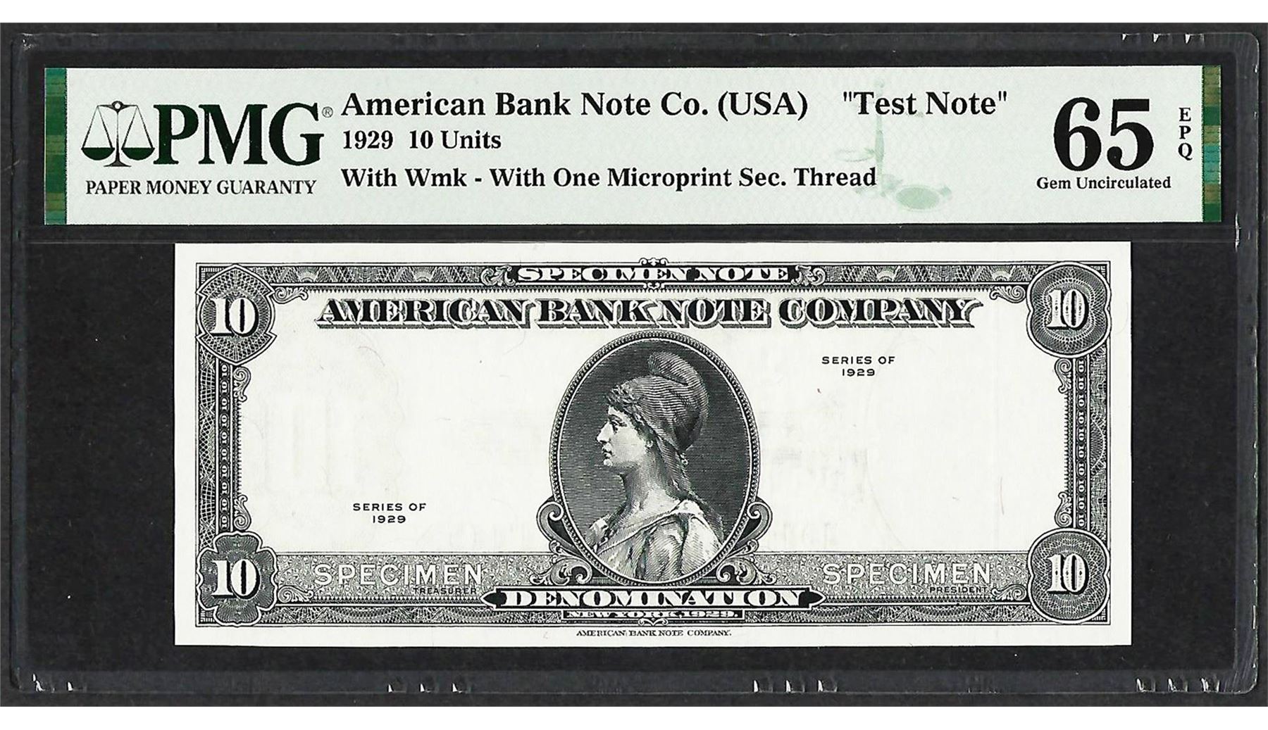 One 1929 10 Unit American Bank Note Co. "Test Note" PMG Gem Uncirculated 65EPQ. PMG Certified.