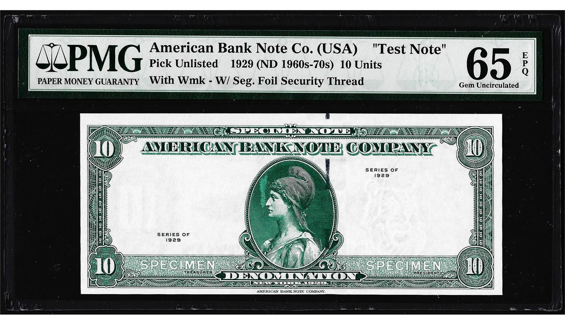 One 1929 10 Unit American Bank Note Co. "Test Note" PMG Gem Uncirculated 65EPQ. PMG Certified.