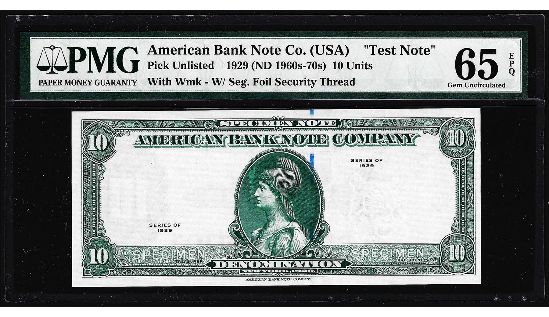 One 1929 10 Unit American Bank Note Co. "Test Note" PMG Gem Uncirculated 65EPQ. PMG Certified.