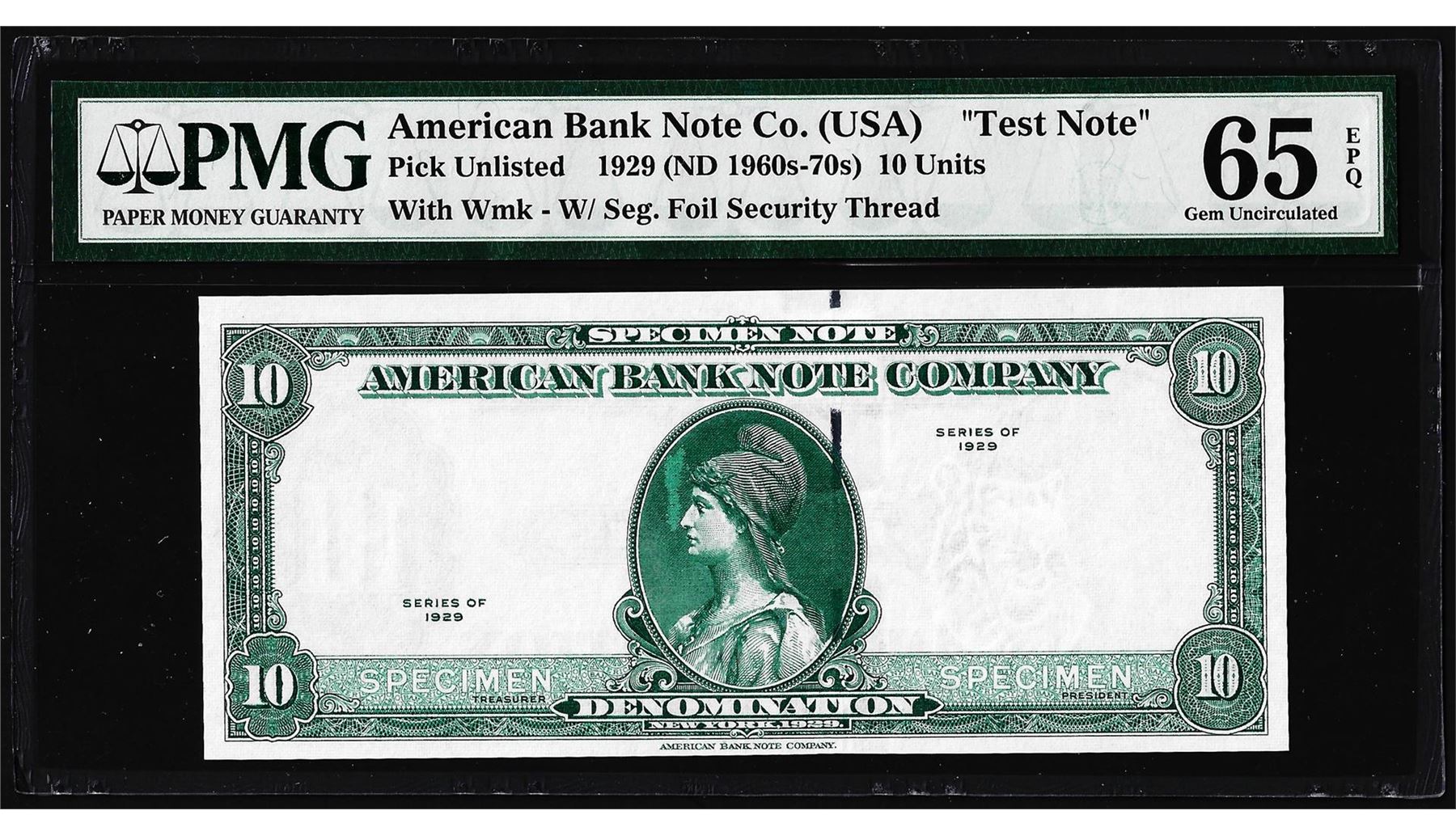 One 1929 10 Unit American Bank Note Co. "Test Note" PMG Gem Uncirculated 65EPQ. PMG Certified.