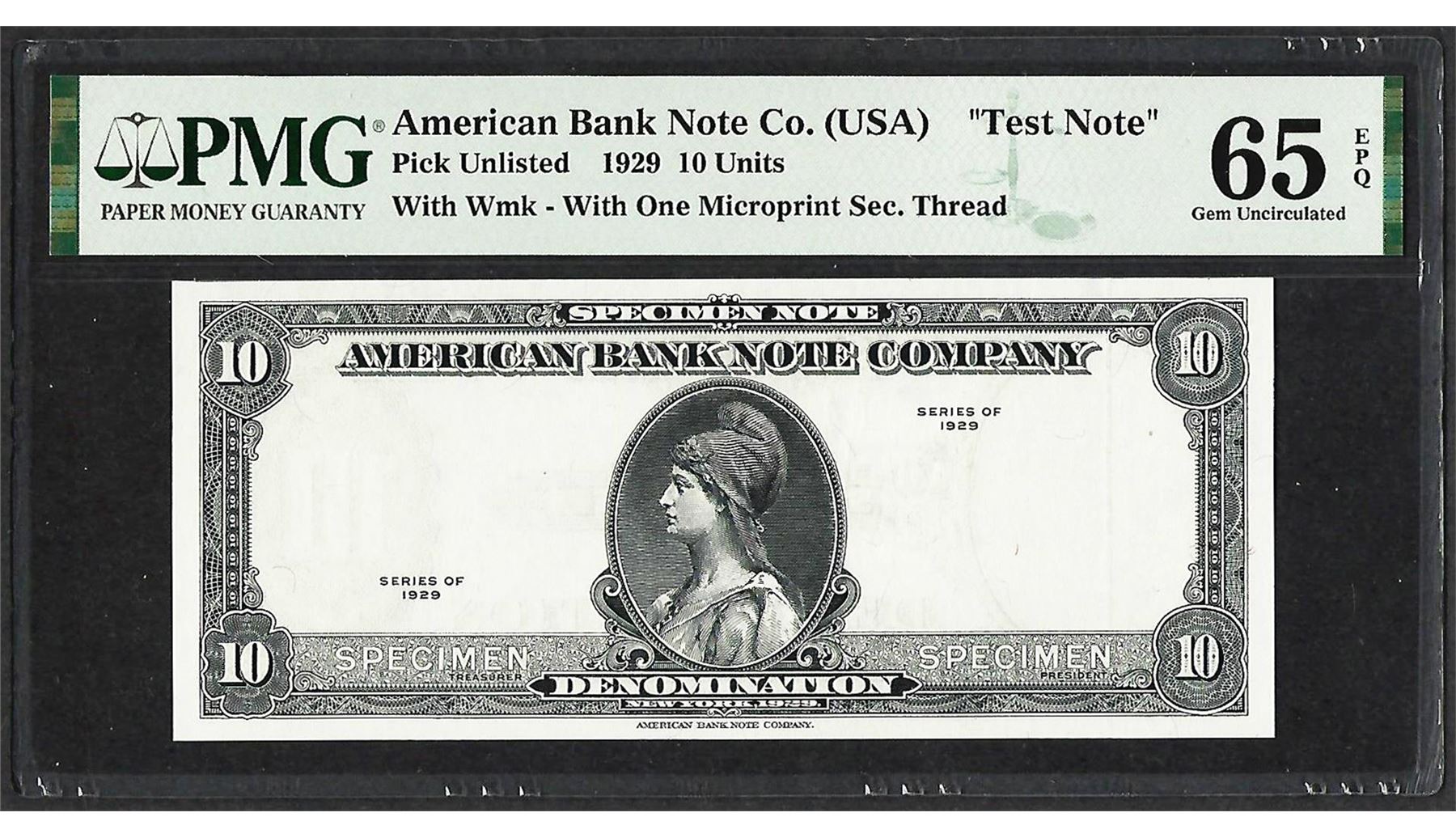 One 1929 10 Unit American Bank Note Co. "Test Note" PMG Gem Uncirculated 65EPQ. PMG Certified.