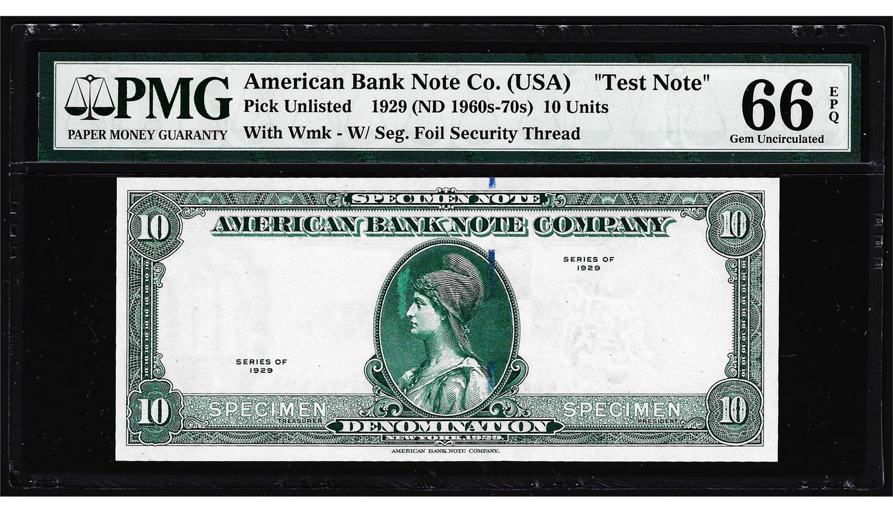 One 1929 10 Unit American Bank Note Co. "Test Note" PMG Gem Uncirculated 66EPQ. PMG Certified.