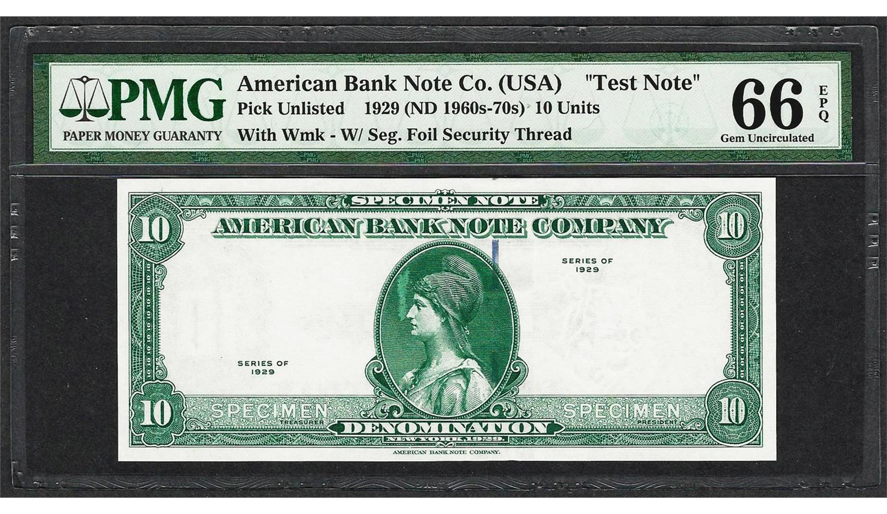 One 1929 10 Unit American Bank Note Co. "Test Note" PMG Gem Uncirculated 66EPQ. PMG Certified.