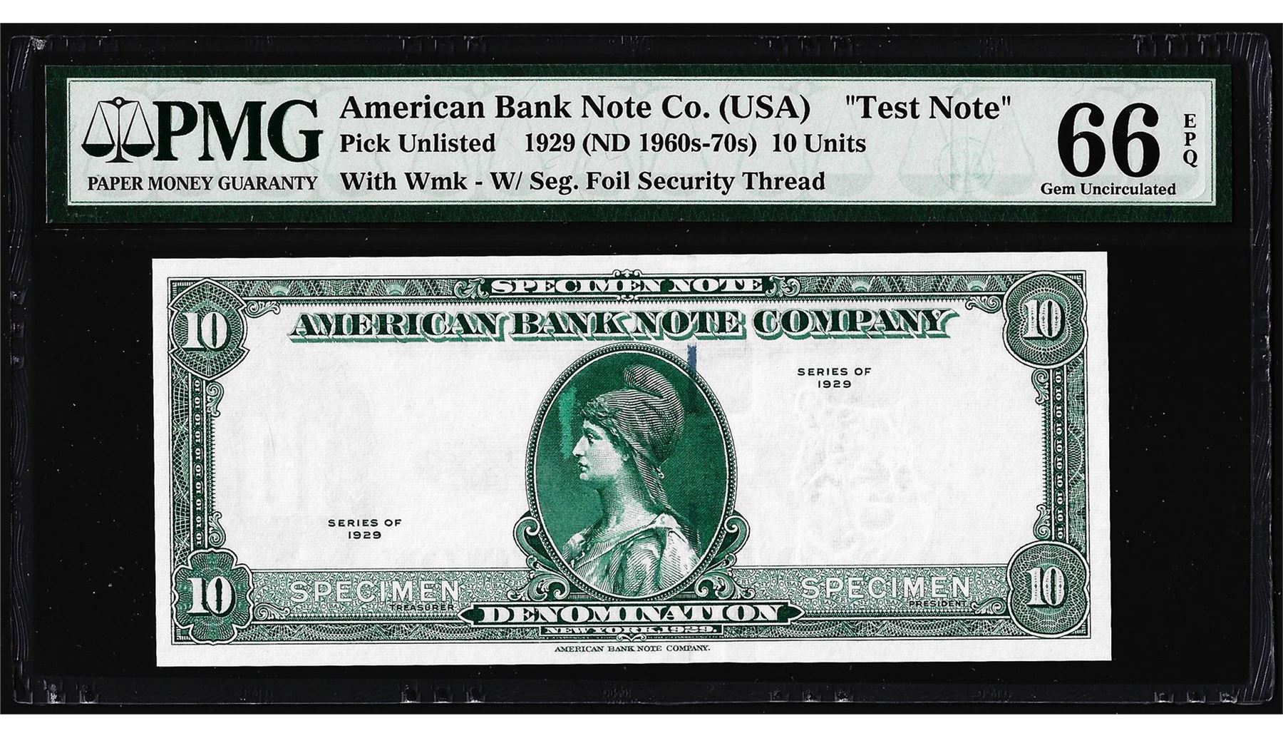One 1929 10 Unit American Bank Note Co. "Test Note" PMG Gem Uncirculated 66EPQ. PMG Certified.