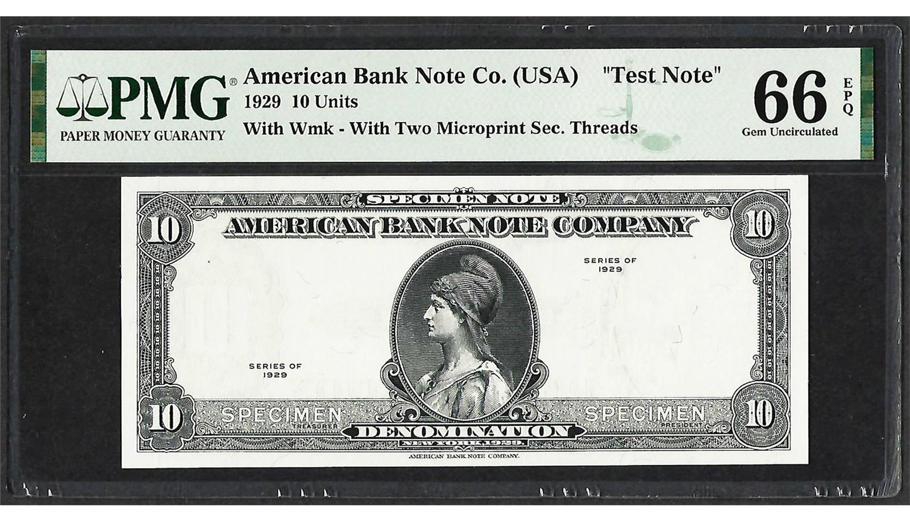 One 1929 10 Unit American Bank Note Co. "Test Note" PMG Gem Uncirculated 66EPQ. PMG Certified.