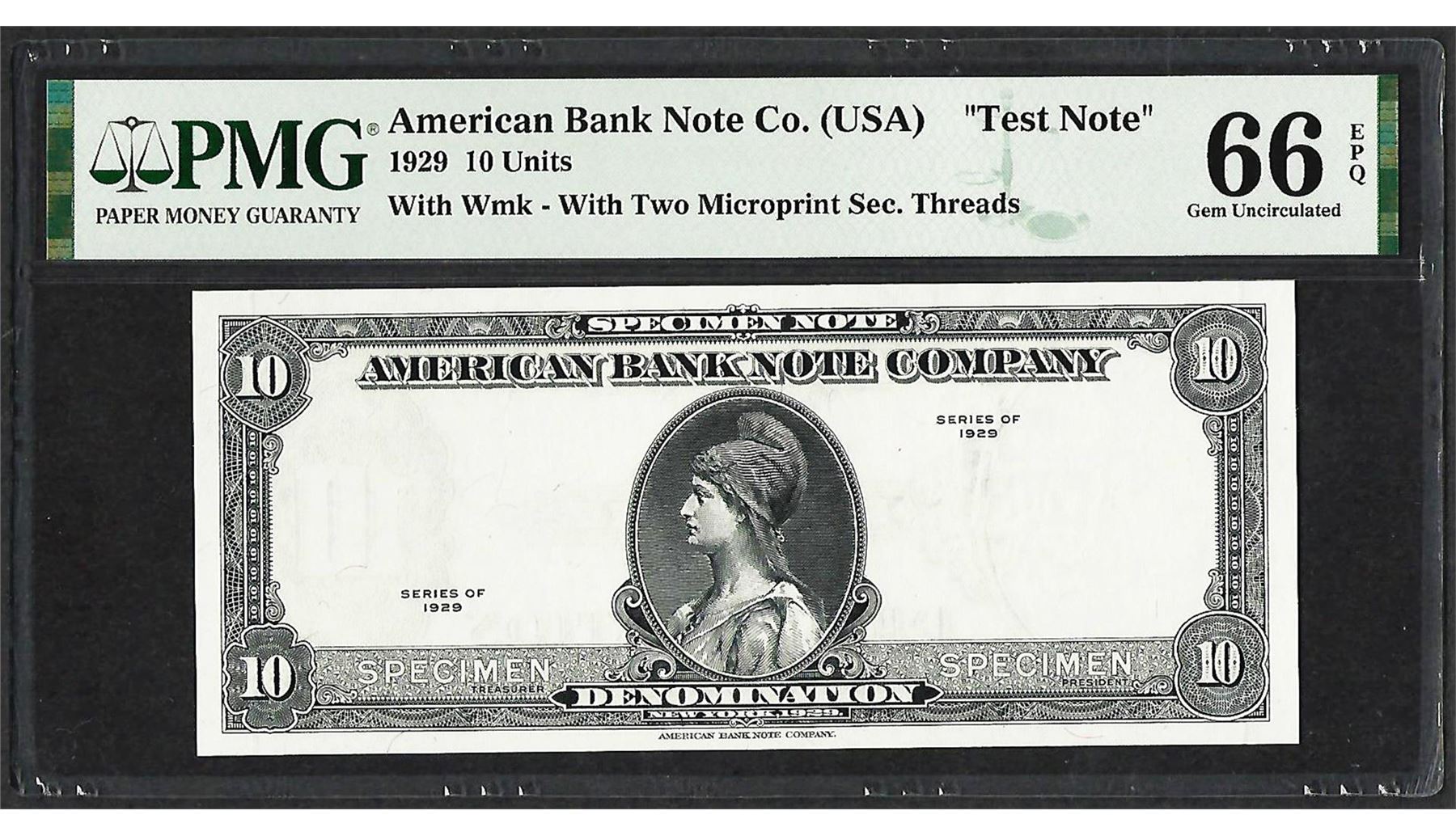 One 1929 10 Unit American Bank Note Co. "Test Note" PMG Gem Uncirculated 66EPQ. PMG Certified.