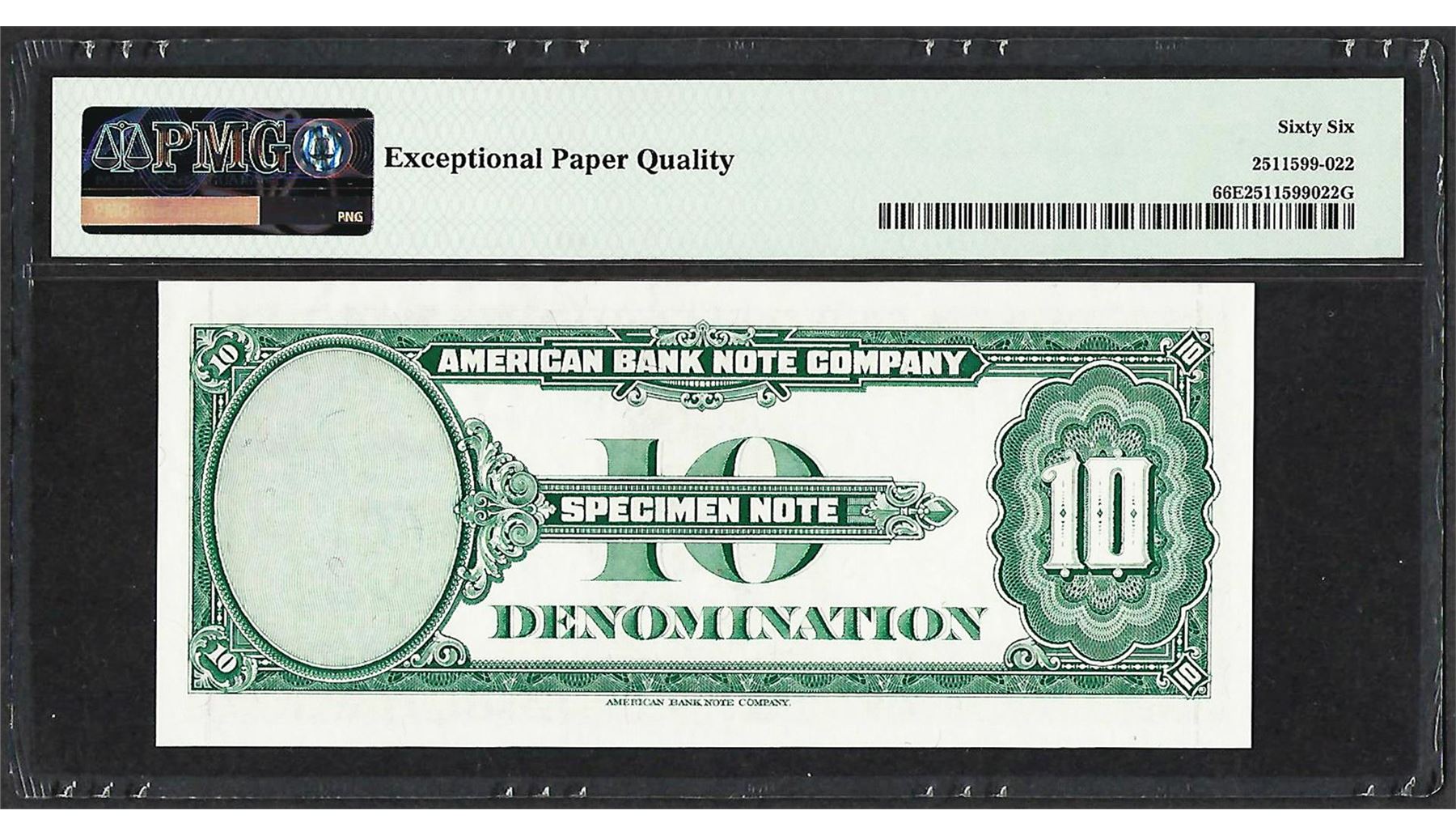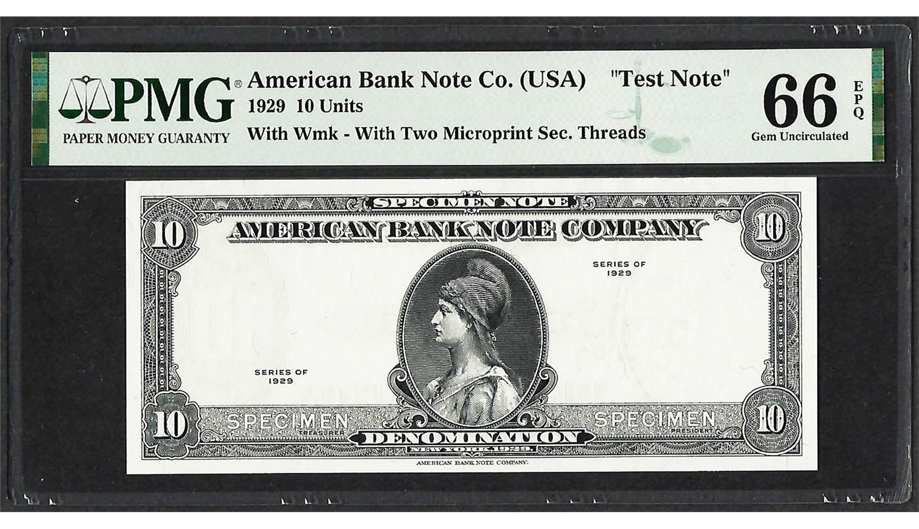 One 1929 10 Unit American Bank Note Co. "Test Note" PMG Gem Uncirculated 66EPQ. PMG Certified.