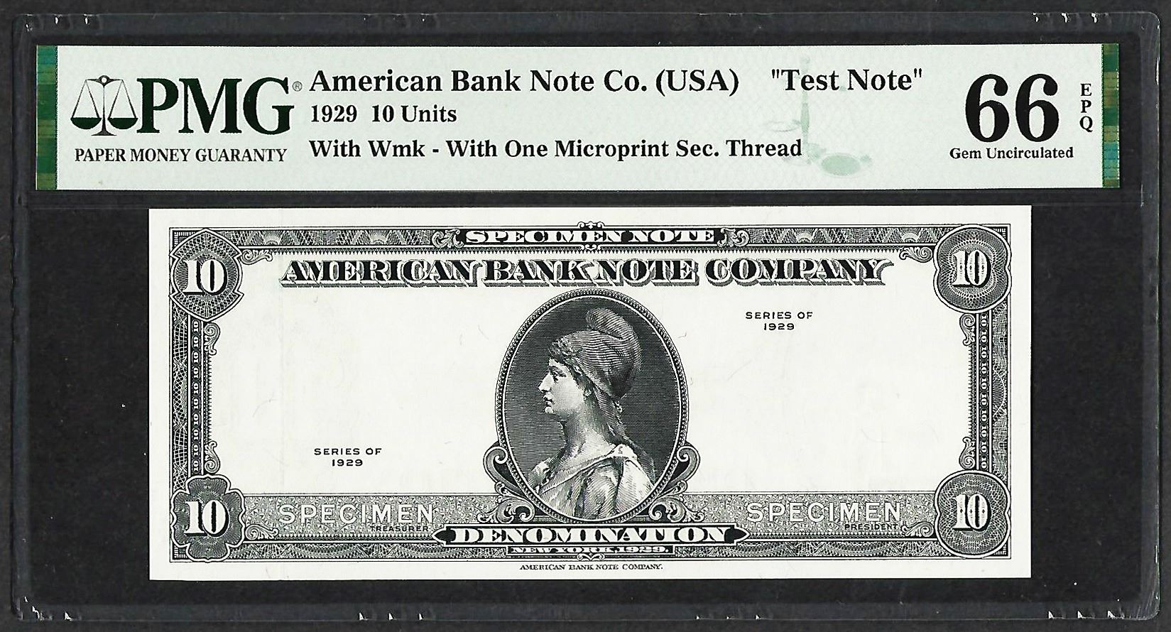 1929 10 Unit American Bank Note Co. "Test Note" PMG Gem Uncirculated 66EPQ