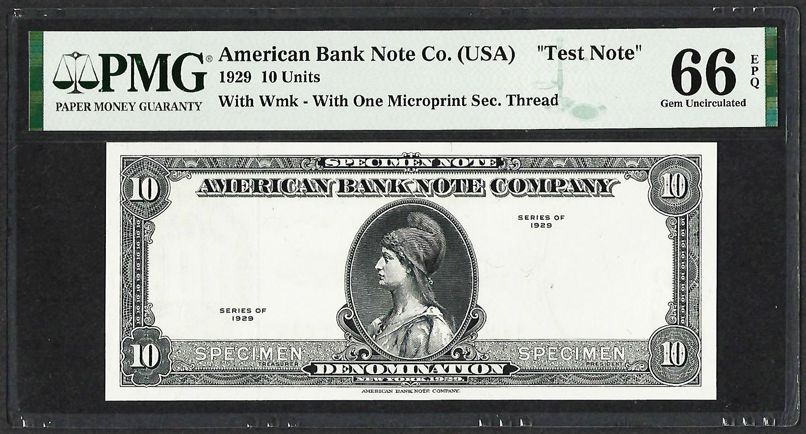 One 1929 10 Unit American Bank Note Co. "Test Note" PMG Gem Uncirculated 66EPQ.