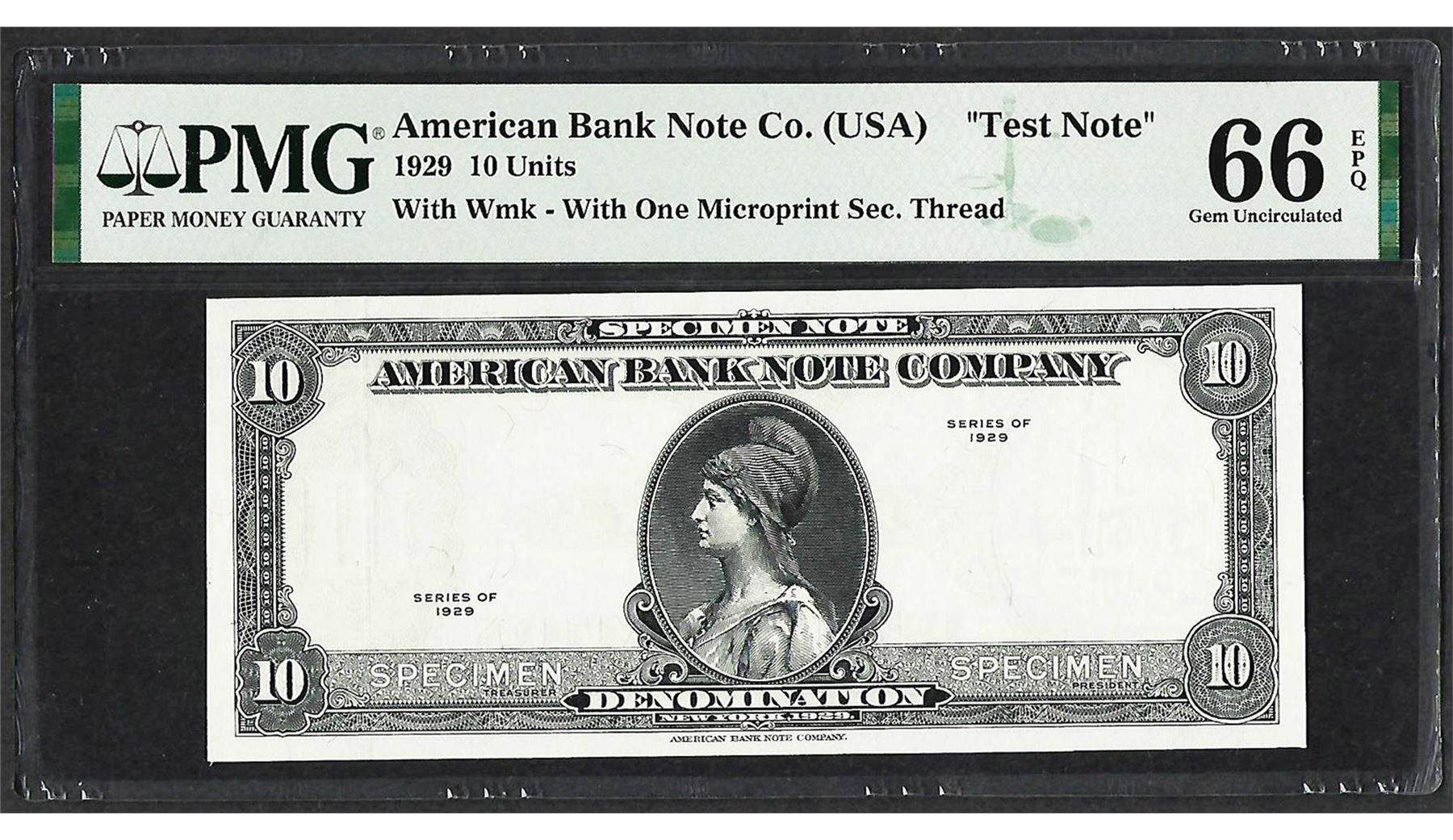 One 1929 10 Unit American Bank Note Co. "Test Note" PMG Gem Uncirculated 66EPQ. PMG Certified.