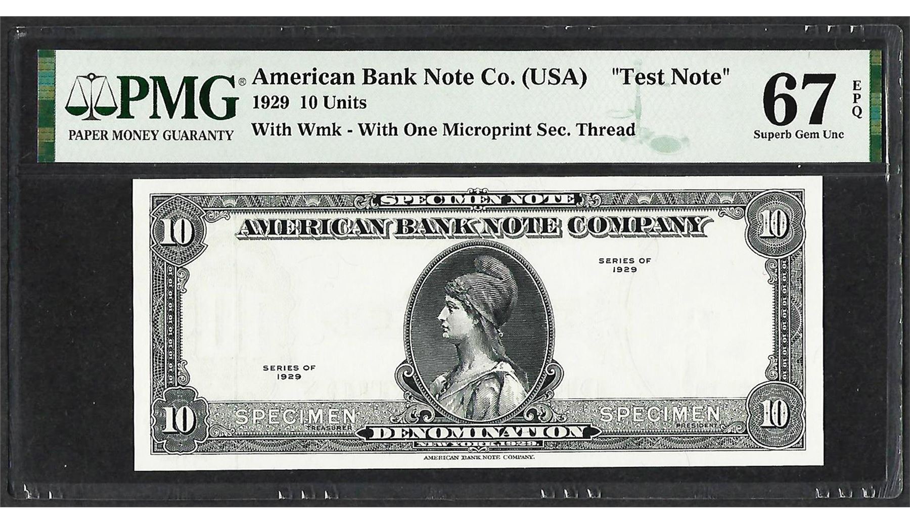 1929 10 Unit American Bank Note Co. "Test Note" PMG Superb Gem Uncirculated 67EPQ