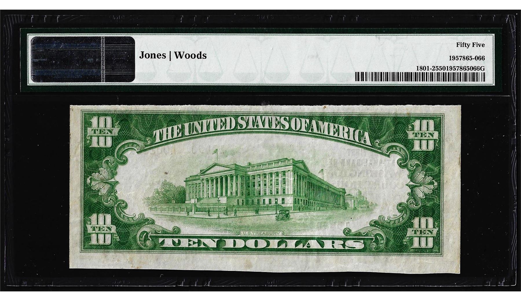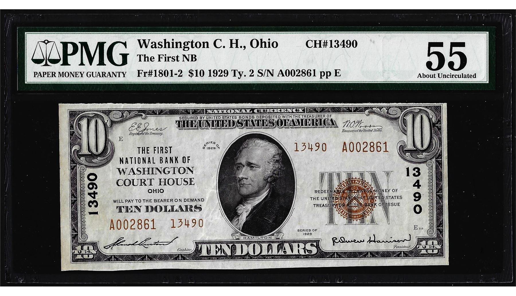 One 1929 $10 Washington Court House, OH CH# 13490 National Note PMG About Uncirculated 55. PMG Certified.
