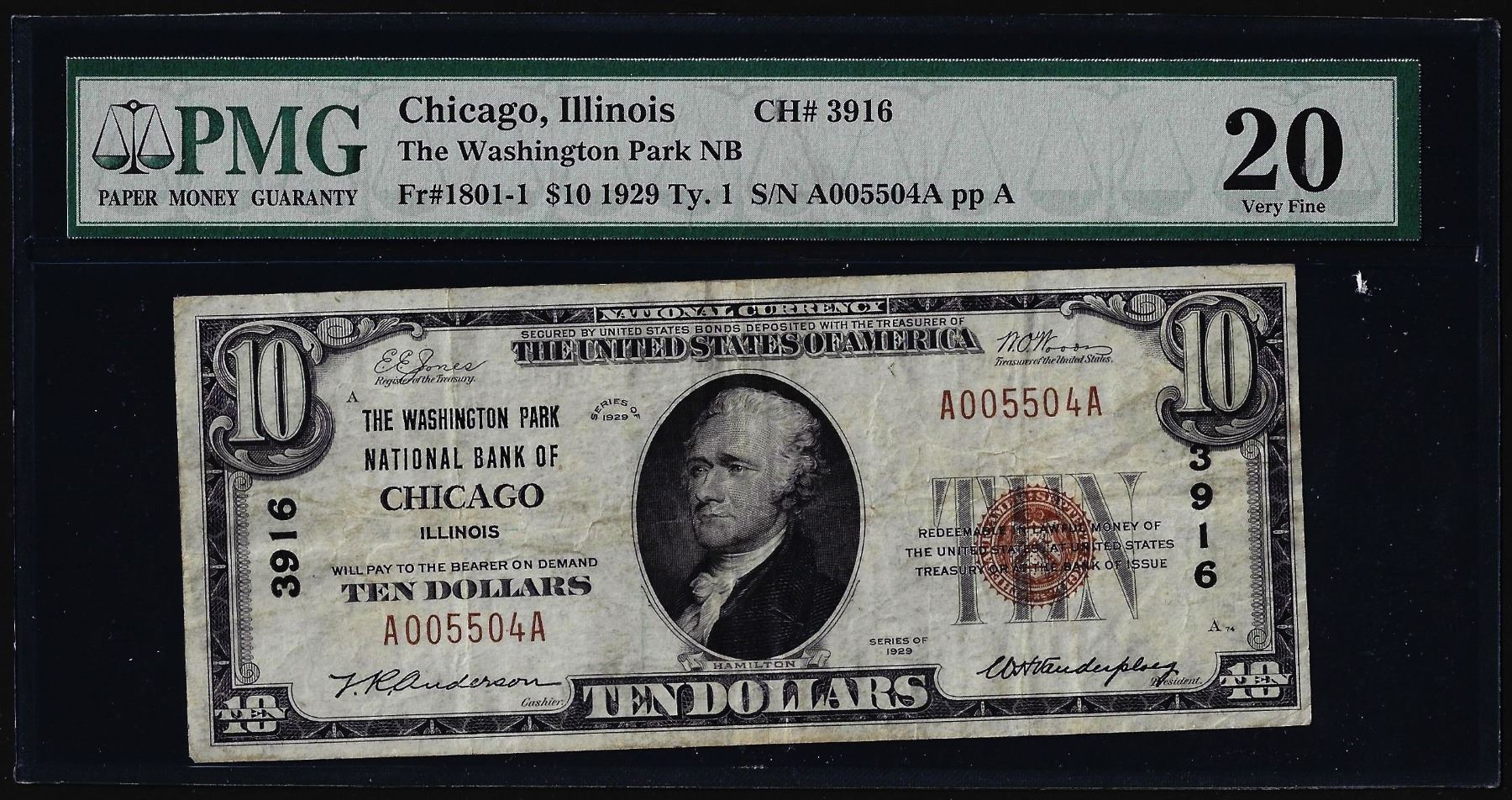 One 1929 $10 Washington Park NB of Chicago, IL CH# 3916 National Note PMG Very Fine 20.