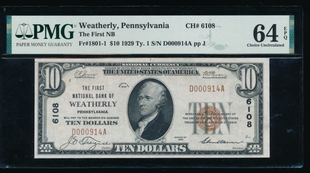 One 1929 $10 Weatherly PA National PMG 64EPQ. Low Serial Number.