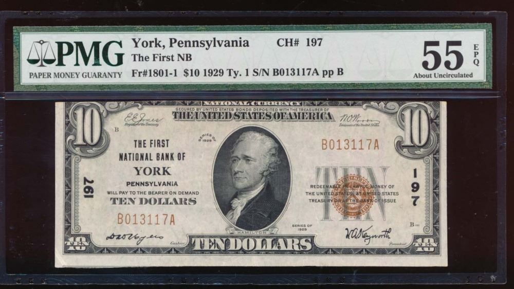 One 1929 $10 York National Bank Note PMG 55EPQ.