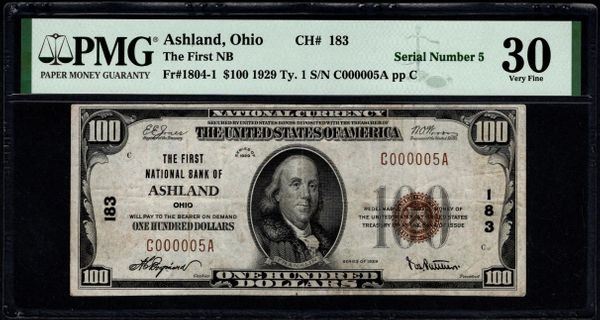 One 1929 $100 Ashland OH National Bank Note PMG 30.