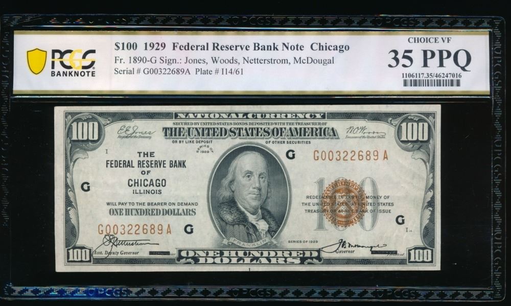 One 1929 $100 Chicago FRBN PCGS 35PPQ.